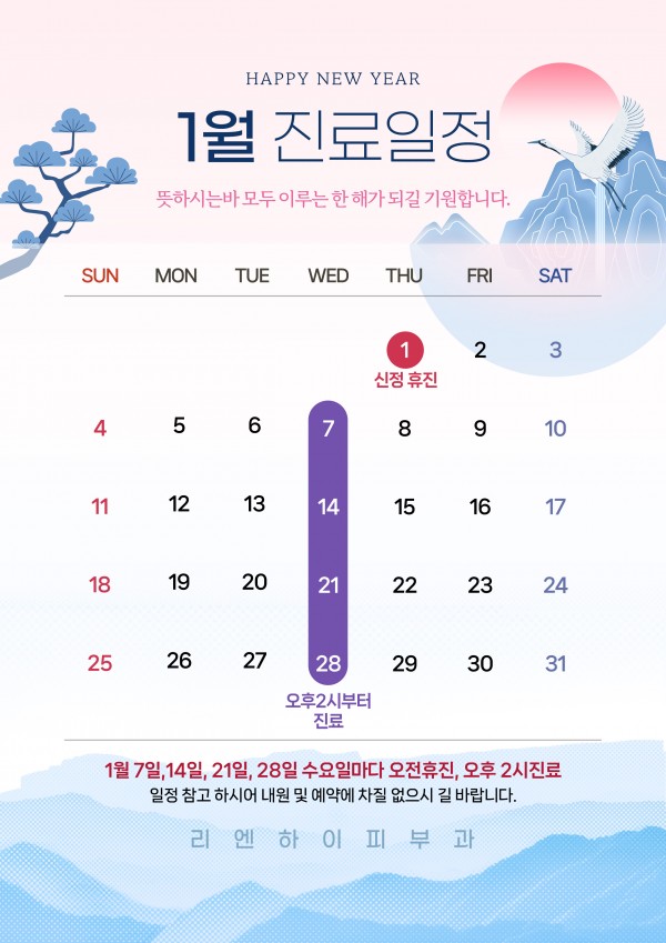 2026년 1월 진료일정 안내 페이지 정보 작성자 관리자 작성일25-12-29 17:49 조회16회 댓글0건 관련링크 다음글 목록 본문 2026년 1월 진료일정 안내 댓글목록 등록된 댓글이 없습니다. 다음글 목록